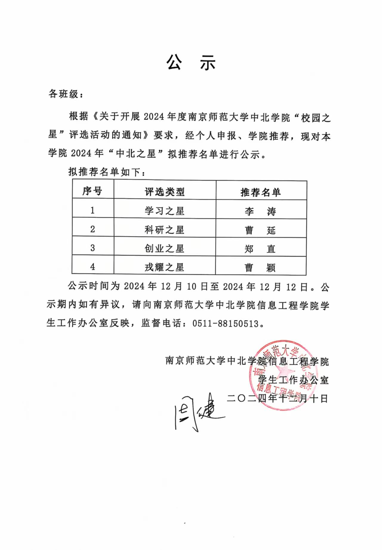 《关于开展2024年度南京师范大学中北学院"校园之星"评选活动的通知》